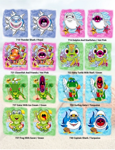 710 Thunder Shark / Royal721 Clownfish And Friends / Hot Pink727 Gator With Ice Cream / Green716 Dolphin And Starfishes / Hot Pink722 Baby Turtle With Reef / Green730 Surfing Gator / Turquoise737 Frog With Saver / Green 740 Captain Shark / Turquoise