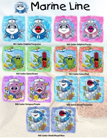 Marine Line901 Sailor Dolphin/Turquoise903 Sailor Gator/Green905 Sailor Shark/Turquoise902 Sailor Dolphin/Fucsia903 Sailor Gator/Red906 Sailor Octopus/Purple905 Sailor Shark/Royal Blue