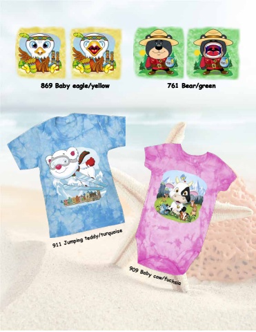 869 Baby eagle/yellow 761 Bear/green911 Jumping teddy/turquoise909 Baby cow/fuchsia