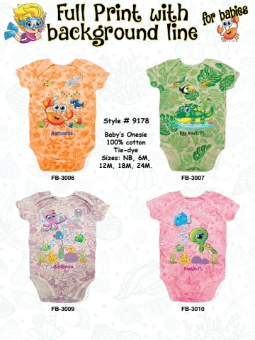 Style # 9178Baby%u2019s Onesie100% cottonTie-dyeSizes: NB, 6M, 12M, 18M, 24M.FB-3006FB-3009FB-3007FB-3010