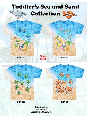 T-Shirt for kids100% cottonSizes:2T,3T,4T,XS(5-7).SEA-001SEA-003SEA-002SEA-004Style9200