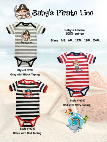 Style # 9230 Style # 9250 Style # 9240 Gray with Black TapingRed with Navy TapingBlack with Red TapingBaby%u2019s Onesie100% cottonSizes: NB, 6M, 12M, 18M, 24M.