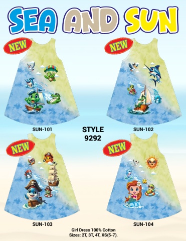 Girl Dress 100% CottonSizes: 2T, 3T, 4T, XS(5-7).STYLE9292SUN-101SUN-103SUN-102SUN-104
