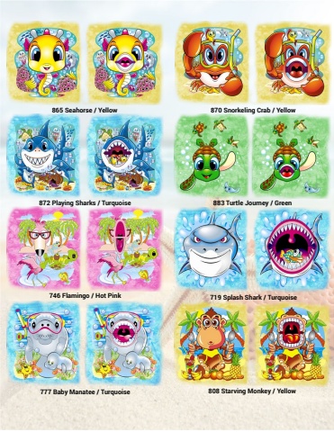 872 Playing Sharks / Turquoise865 Seahorse / Yellow 870 Snorkeling Crab / Yellow883 Turtle Journey / Green746 Flamingo / Hot Pink 719 Splash Shark / Turquoise777 Baby Manatee / Turquoise 808 Starving Monkey / Yellow