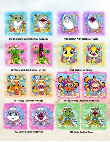843 Snorkeling Baby Dolphin / Turquoise727 Gator With Ice Cream / Hot Pink 865 Seahorse / Yellow841 Happy Clownfish / Orange902 Sailor Dolphin / Hot Pink 907 Sailor Turtle / Green941 Snorkeling Clownfish / Hot Pink936 Dolphin With Octopus / Purple