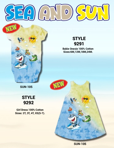 SUN-105SUN-105STYLE9291Babie Onesie 100% CottonSizes:6M,12M,18M,24M.STYLE9292Girl Dress 100% CottonSizes: 2T, 3T, 4T, XS(5-7).